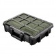 The large deep BUNKER tool storage organiser is made from durable, impact-resistant plastic. It features 20 removable bins securely held in the base of the case, providing efficient organisation of your tools and other items - 16 deep square bins and four deep rectangular bins. The design of the lid, along with a secure latch, ensures that contents remain organised within the bins. Additionally, the lid is water resistant keeping the contents dry. The transparent lid allows for easy visibility of the stored items, and the molded grip makes it comfortable to carry