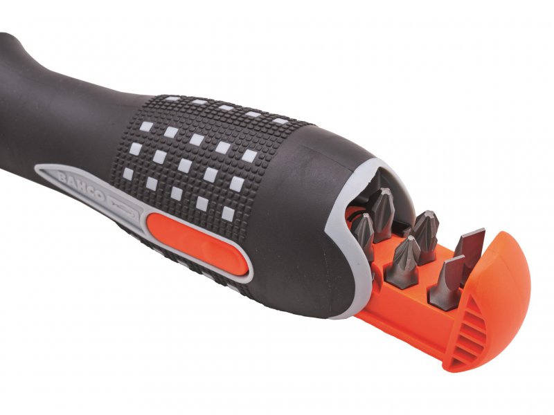 The handle is a three-component handle with textured finish for maximum torque and minimum effort. Has an interchangeable bit storage compartment with release button for quick access.
