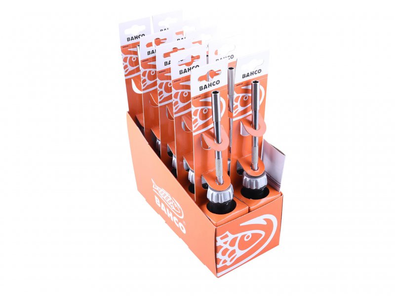 The XMS 808050 Ratchet Screwdriver Set, made by Bahco, is a 1/4in ratcheting bit holder screwdriver with a magnetic bit holder.