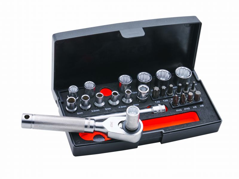 The Special Edition Bahco SL25 is a handy 1/4in set complete with 12 sockets made from hardened chrome vanadium, a bit set with a dynamic drive profile and a quick-release all metal ratchet.