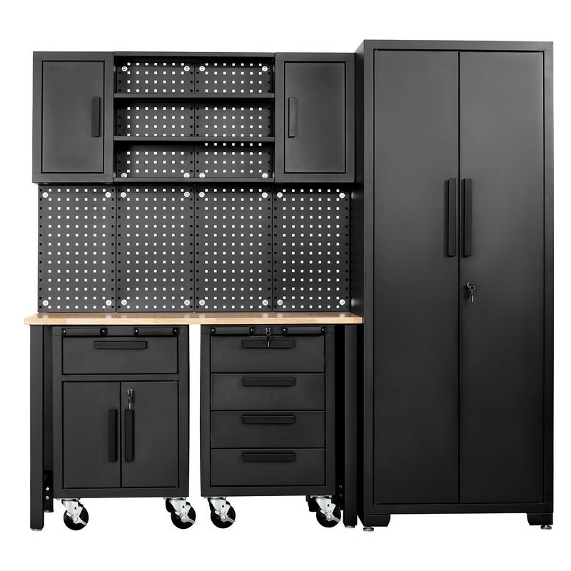 This complete steel storage unit combines one tall cabinet with two doors and three fitted shelves, wall and shelf unit, two mobile cabinets and a pressed wood worktop. There are also four back panels forming a pegboard for holding tools and equipment. The two roller cabinets have 4 castors, two swivel and fitted with brakes. It is styled with a matt black painted finish and is fitted with adjustable feet for stability. A fully lockable system is in place for security (three keys provided). The workstation is supplied semi-flat packed and requires assembly. This is a complete storage solution (individual components are not available separately).