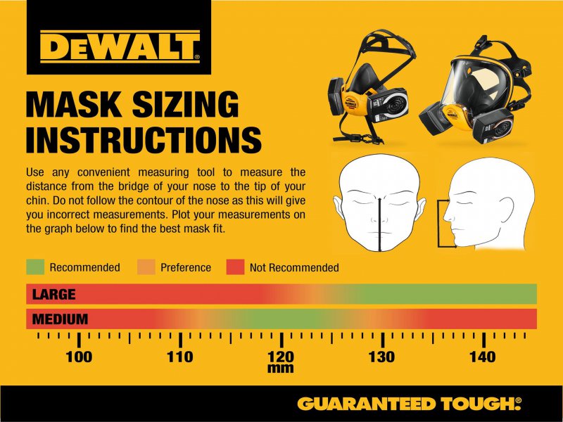DEWALT Reusable Half Mask Respirator with A2P3 filters. Provides protection in workplaces which have high levels of fine dust, lead, silica, MDF particles, or other forms of industrial pollutents in the air.