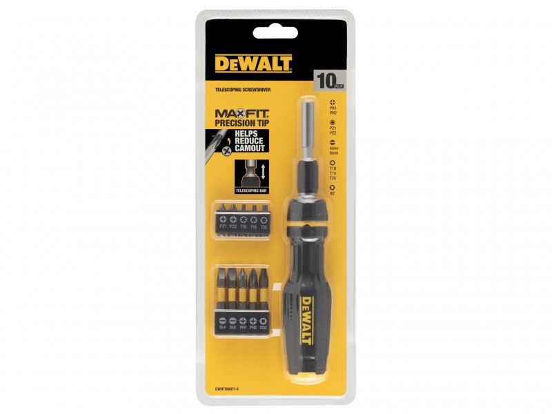 Take advantage of a consistent, near-perfect fit within fasteners using this DEWALT® MAX FIT® Telescoping Multi-Bit Screwdriver Set. The included Ratcheting Screwdriver was designed to optimize fastener fit for reduced slippage and stripping of screws. Its bi-material grip is engineered for less hand strain and high torque to help you comfortably tackle multiple projects with bits stored conveniently in handle’s end.