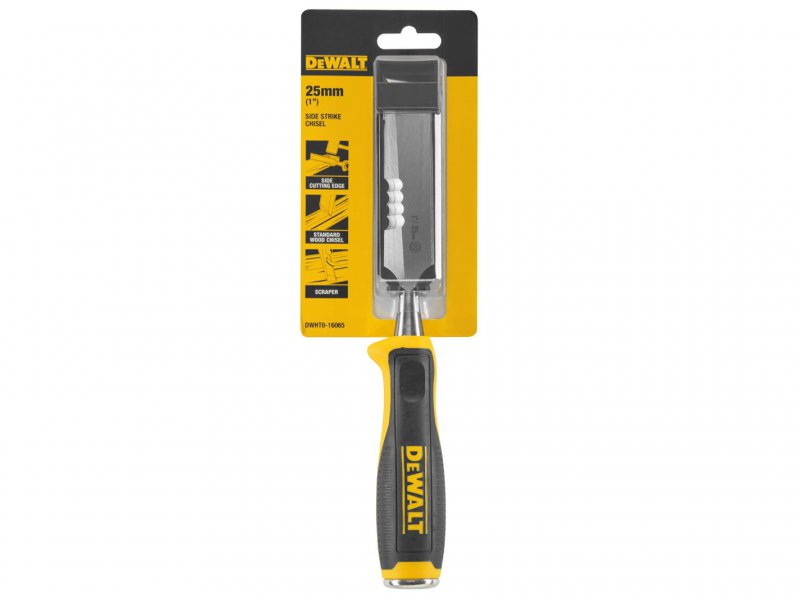 The DEWALT Side Strike Chisel can be used for demolition and scraping. The hardened, tempered chrome carbon-steel blade has a serrated cutting edge. There is also a cutting edge on the side of blade for demolition work, also allows the chisel to double as a scraper. Fitted with an ergonomically designed bi-material handle and a hardened strike cap for durability.