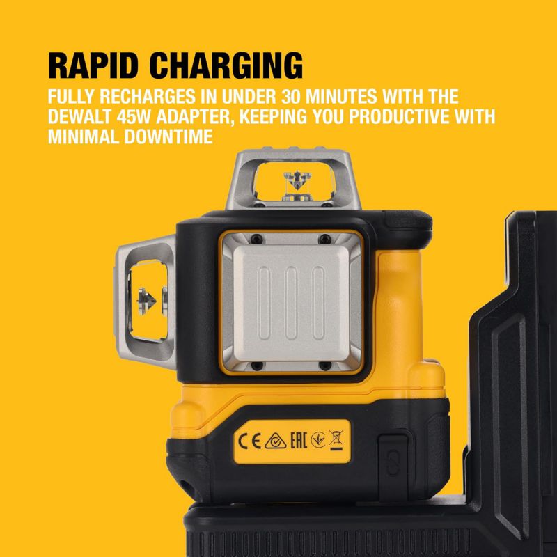 - RAPID CHARGING FOR MINIMAL DOWNTIME: enabling the device to reach a full charge in under 30 minutes when used with the DEWALT 45W USB-PD power adapter (sold separately). Users can continue working while plugged in, ensuring uninterrupted productivity.