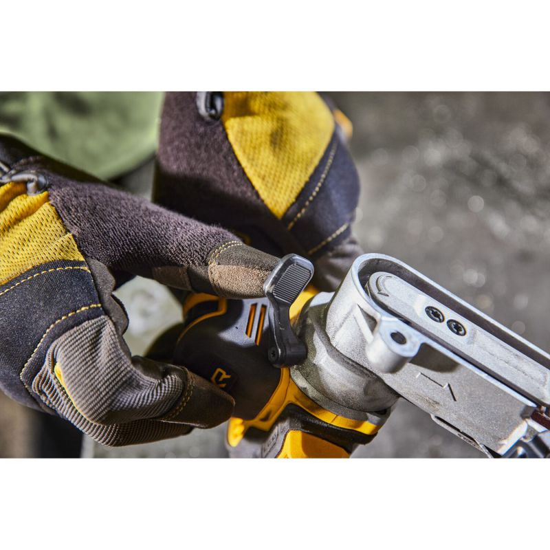 The DCM200 Bandfile is engineered for tough commercial applications rotating up to 1,700 m/min. This power is controlled with a variable speed trigger and speed setting dial. A 173° pivoting arm enables the user to take full advantage of the portability and versatility and to access hard to reach spaces. Coupled with a Rotating LED to help illuminate the workspace and tool-free belt change the DCM200 provides user convenience, mobility and versatility. It joins 250+ products in the 18V XR system.