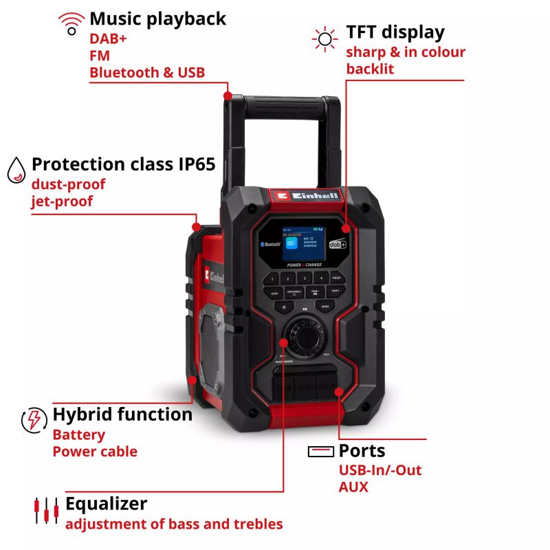 The Einhell cordless radio TE-CR 18 Li DAB+/FM/BT - Solo is a must-have for spreading good mood on any building site. This sturdy radio is a member of the Power X-Change family, where all batteries, system devices and chargers can be flexibly combined across the system. Alternatively, the radio can also be powered via the included 1.8 m long power cable. This cordless building site radio receives digital DAB+ and FM stations and you can store up to 30 stations each. An automatic search function makes it easier to find stations, while the RDS feature displays information such as song title, station name and traffic information directly on a crisp TFT colour display. Apart from receiving radio broadcasts, the device can also play music via Bluetooth, USB and AUX. In addition, external devices such as a smartphone can be conveniently charged via the USB-Out port. The built-in equalizer for fine-tuning the bass and trebles can create a custom sound experience. The sturdy housing with soft grip frame and the battery protector are certified in accordance with protection class IP65 and are therefore dust-proof and jet-proof – ideal for demanding environments such as building sites or for outdoor use. Two large speakers provide powerful stereo sound and the foldable shockproof aerial guarantees optimal reception. A built-in alarm clock with two adjustable alarm times, a sleep function for automatic switching off and a wide, foldable carrying handle provide a high level of comfort. The Einhell cordless radio TE-CR 18 Li DAB+/FM/BT - Solo is supplied without a battery or charger. These are available separately.