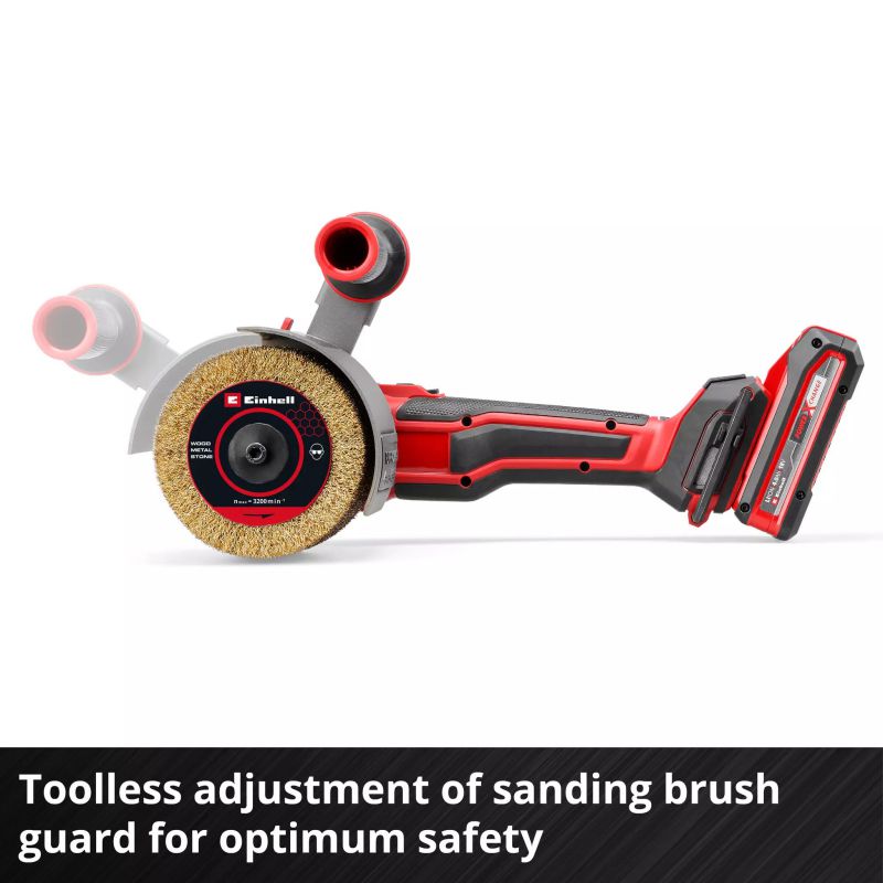 Comes with a 100mm wide, Ø 120mm brass wire brush. This can be used to clean metal and hard-wearing stone, or to refresh and highlight the grain of wood. Other brushes, for example made of nylon, synthetic fibre, abrasive strips or abrasive flaps, are available separately. Brush changes are made by means of the locking knob and the supplied hexagon key.