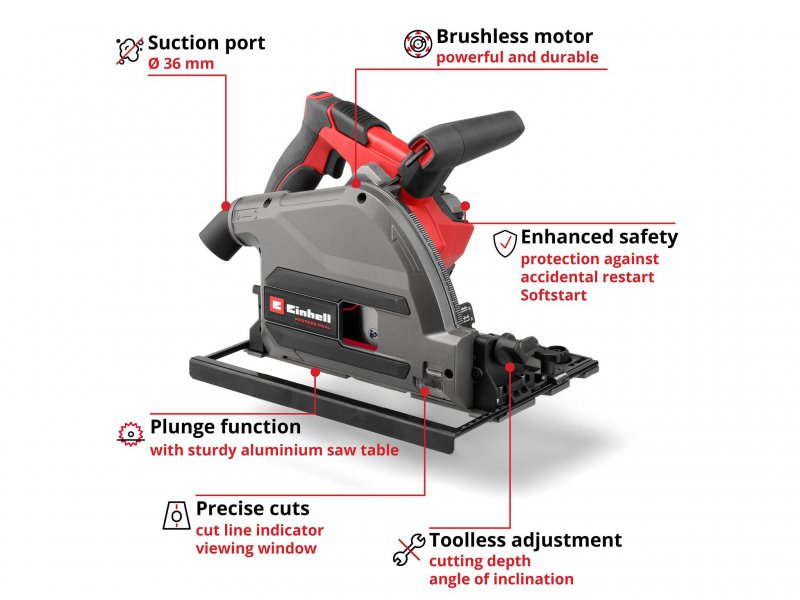 The Einhell TP-PS 18/165 Li BL PROFESSIONAL Plunge Cut Saw is a true all-rounder in the workshop. Whether wood, panels or plastics: With the plunge function, you can directly enter the workpiece from above. Powered by an Einhell Brushless motor. This brushless motor offers more power and a longer running time than conventional carbon brush motors. Once you register online, the brushless motor has a 10-year guarantee. Safety at work is ensured by soft start, engine brake and restart protection.