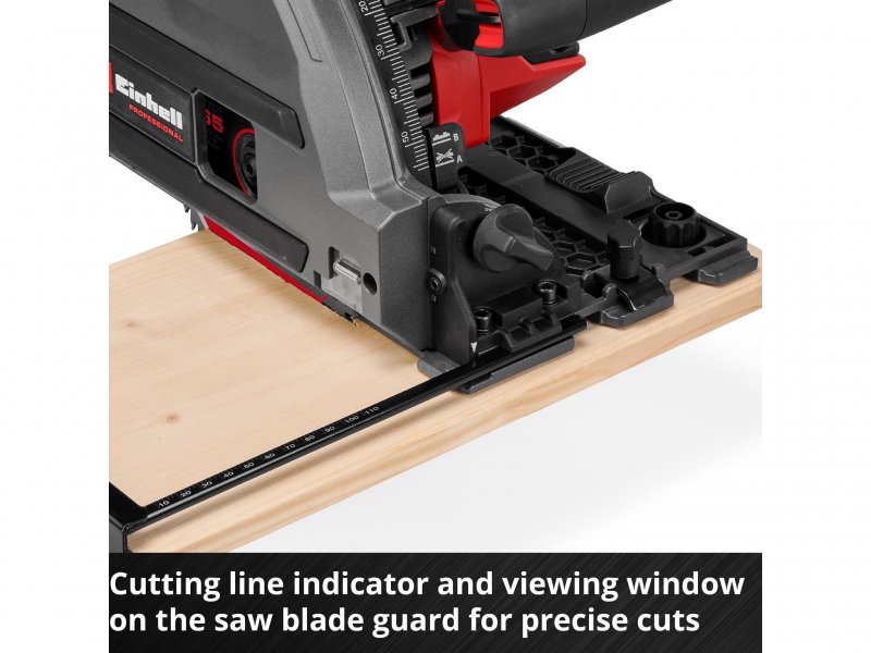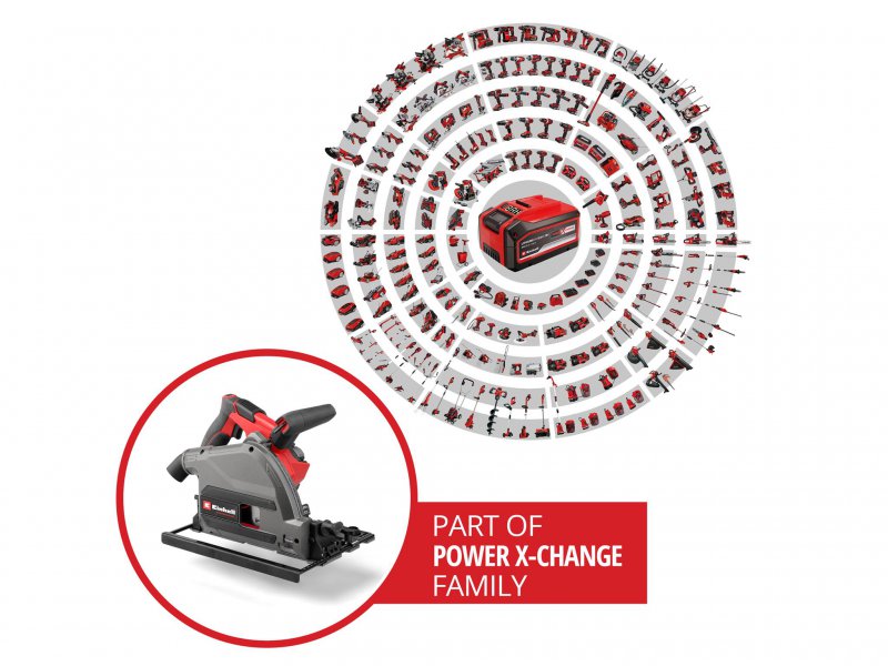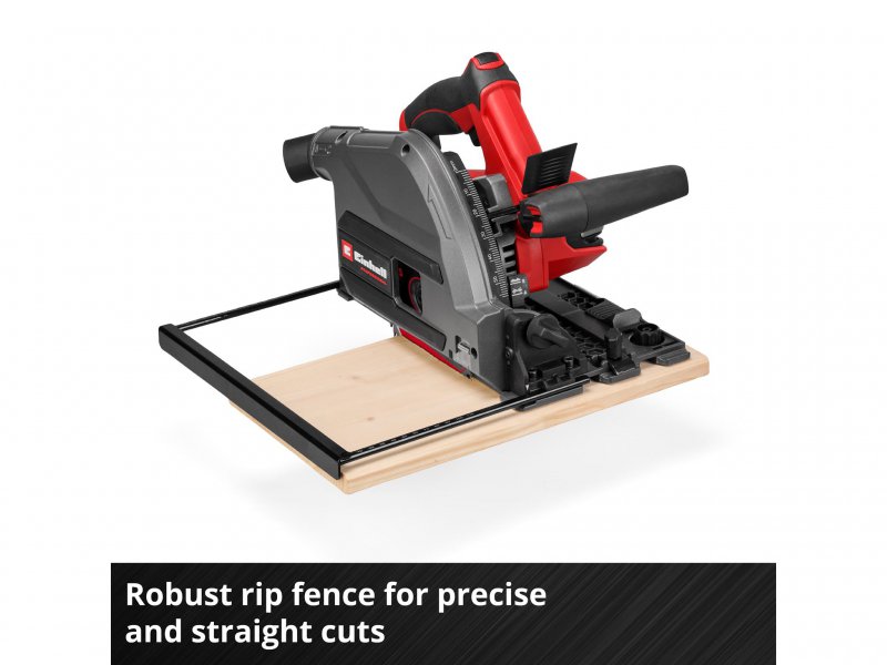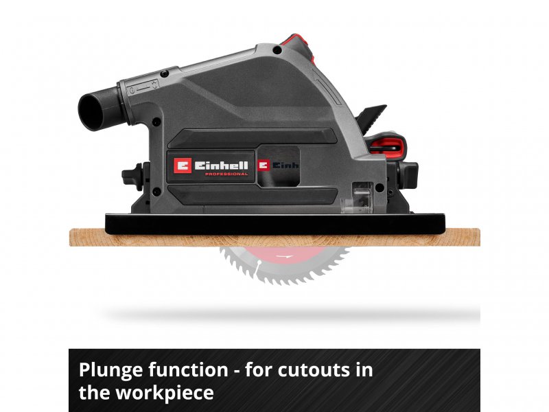 Equipped with an ergonomic main handle and front handle. The softgrip surfaces also ensure fatigue-free working. Cutting depth and tilt angle can be adjusted easily and without tools. The high-quality carbide-tipped saw blade (Ø 165mm) works powerfully through materials up to a cutting depth of up to 56mm at 90° (without guide rail). Clean cuts are also guaranteed in the area of use close to the edge. An integrated swiveling suction connection keeps your workspace clean at all times. In addition, the cordless plunge saw is compatible with the Einhell guide rail system.