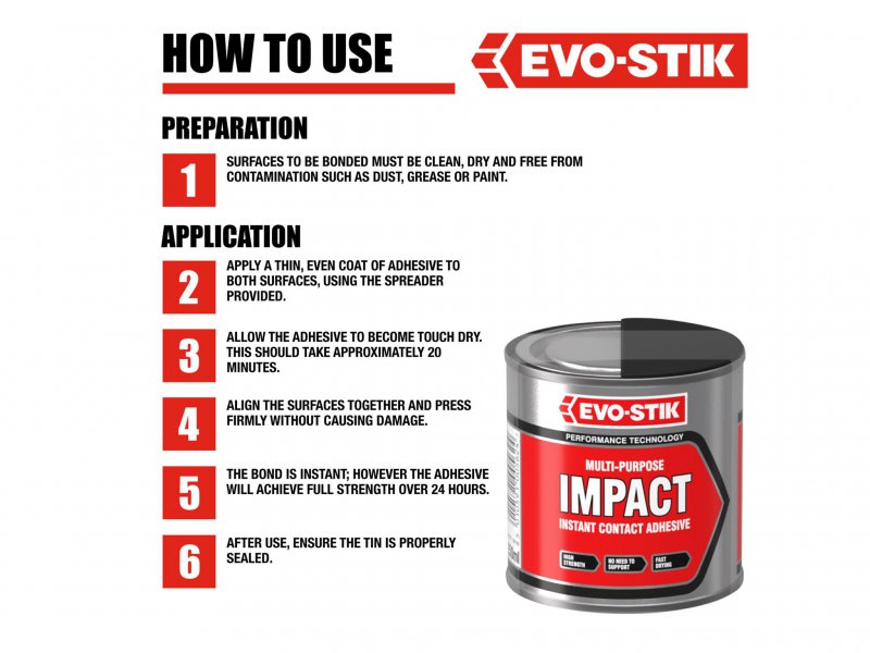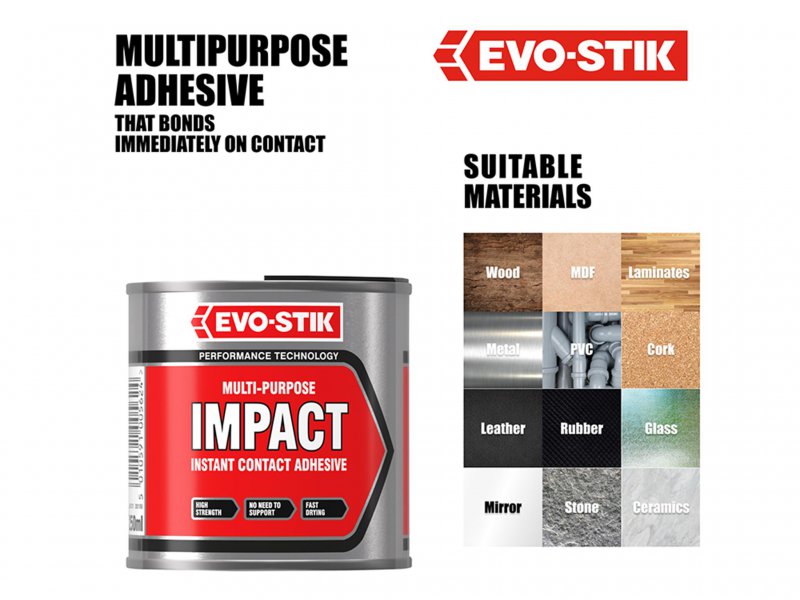 A one-part contact adhesive ideal for numerous jobs around the home and in the workshop. Provides a High strength strong bond on contact without the need for special support, jigs, clamps or weights.