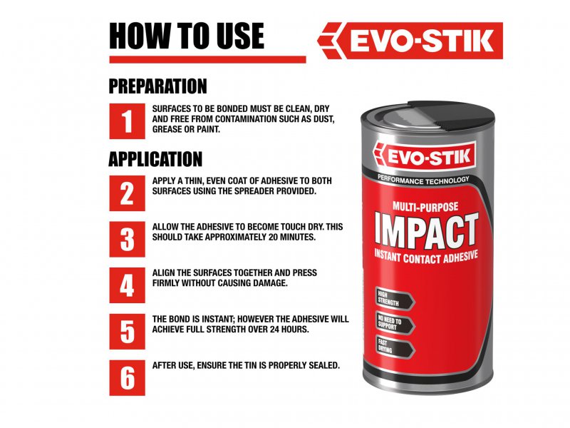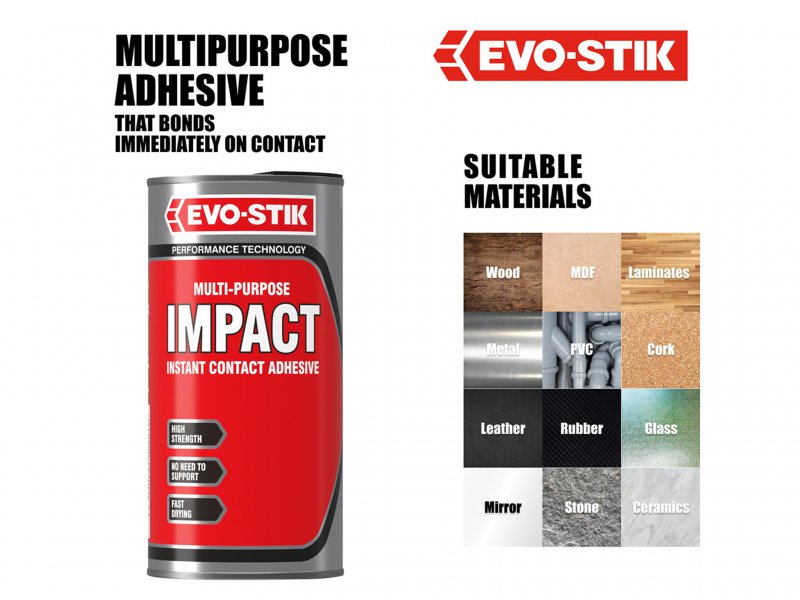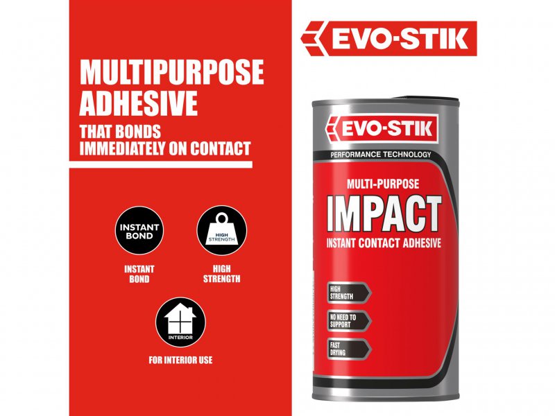 A one-part contact adhesive ideal for numerous jobs around the home and in the workshop. Provides a High strength strong bond on contact without the need for special support, jigs, clamps or weights.
