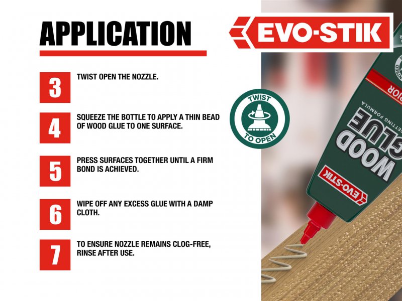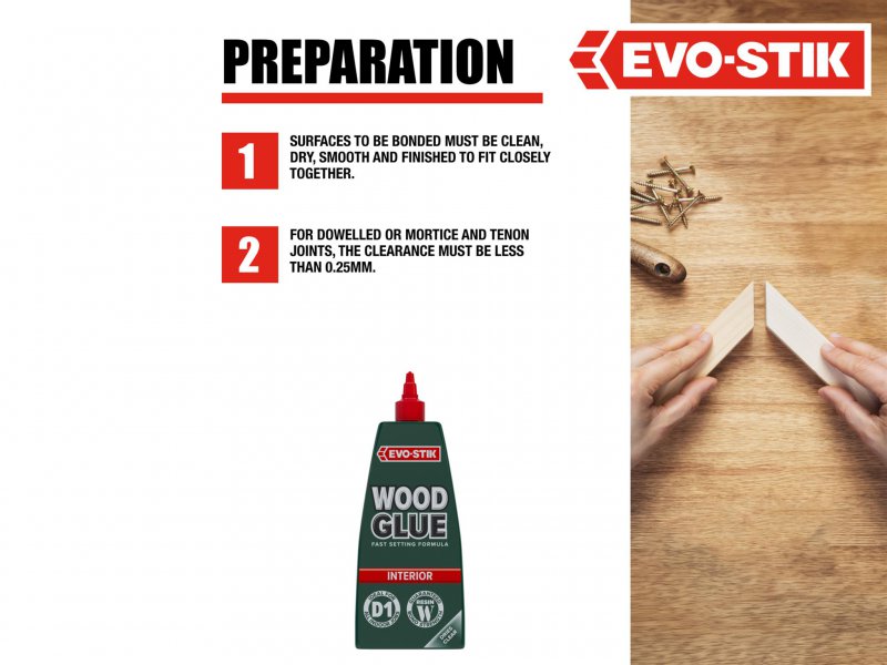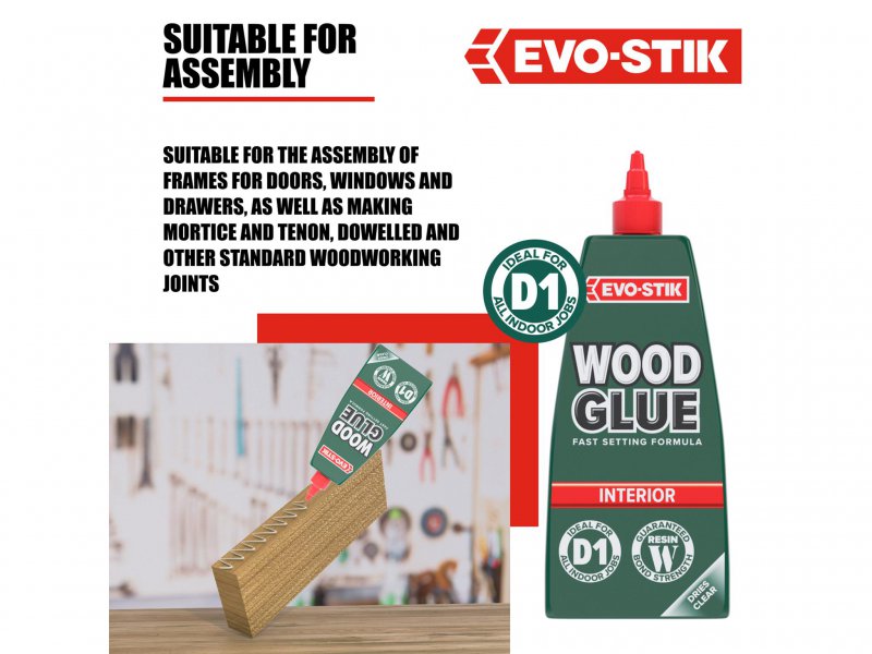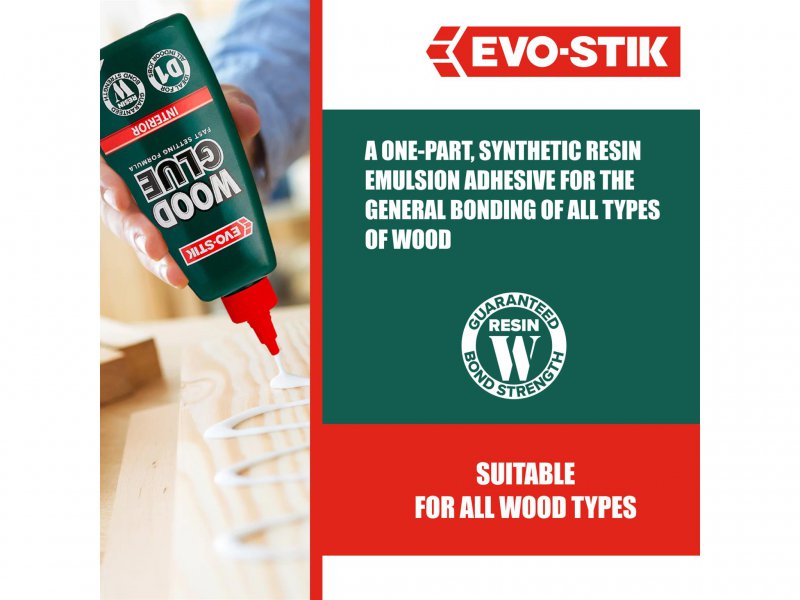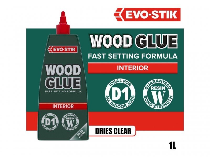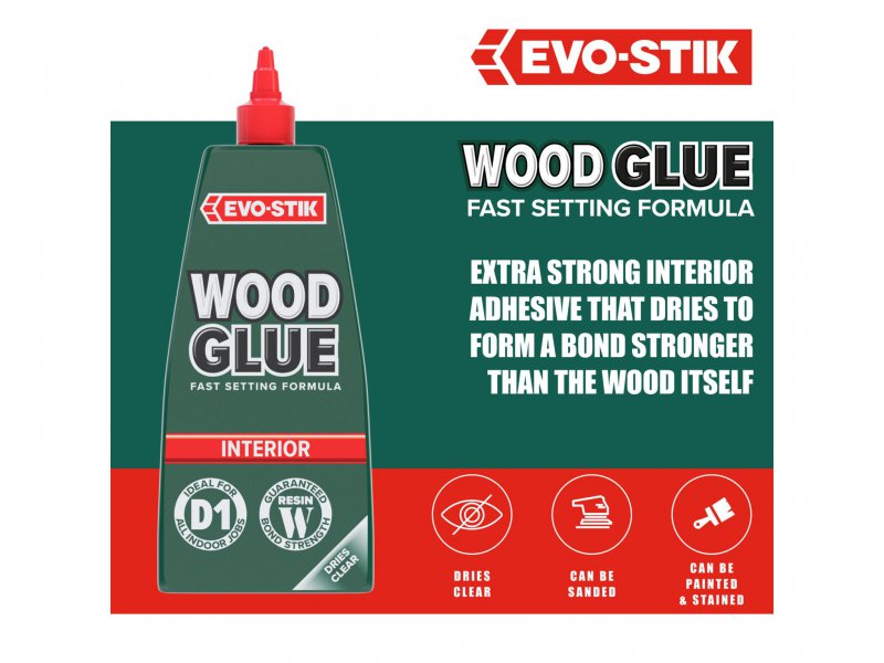 EVO-STIK Wood Glue Interior is an extra strong, fast-setting glue that dries to form a bond stronger than the wood itself. It dries to a clear finish that can be sanded, painted or stained and is suitable for all types of wood.
