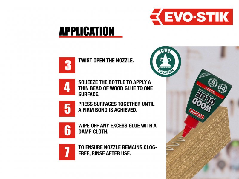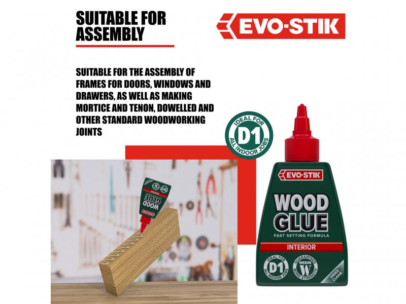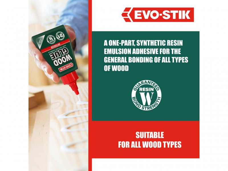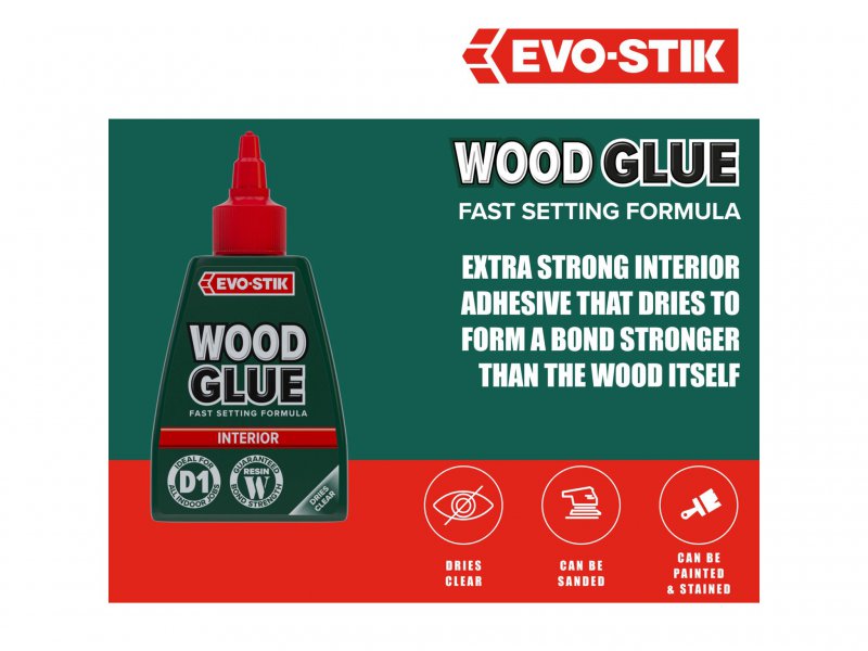 EVO-STIK Wood Glue Interior is an extra strong, fast-setting glue that dries to form a bond stronger than the wood itself. It dries to a clear finish that can be sanded, painted or stained and is suitable for all types of wood.