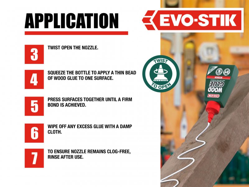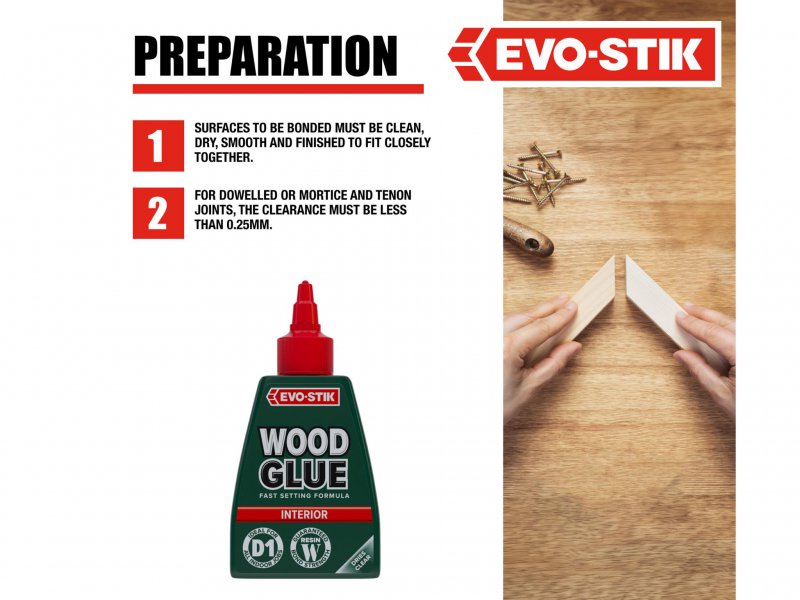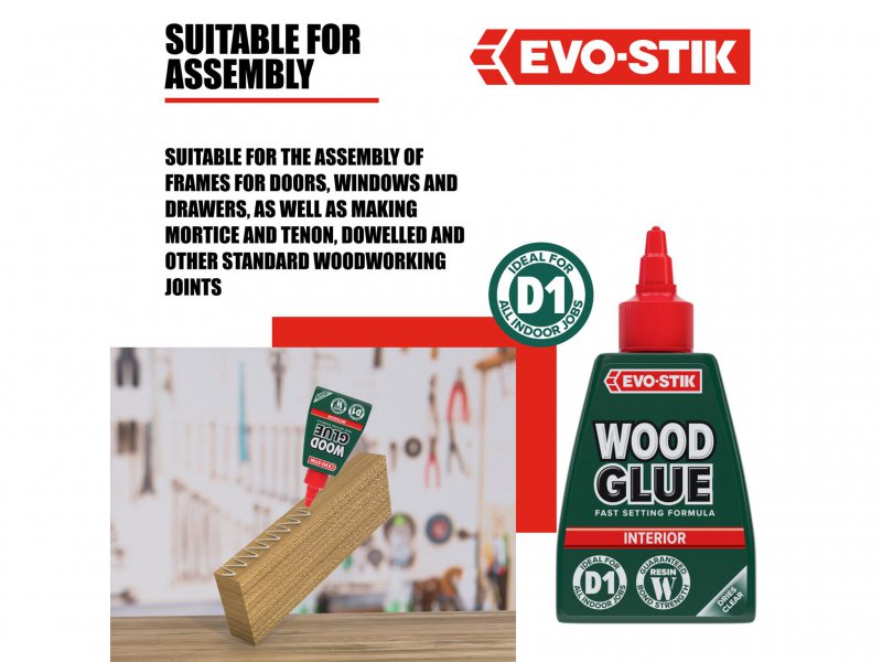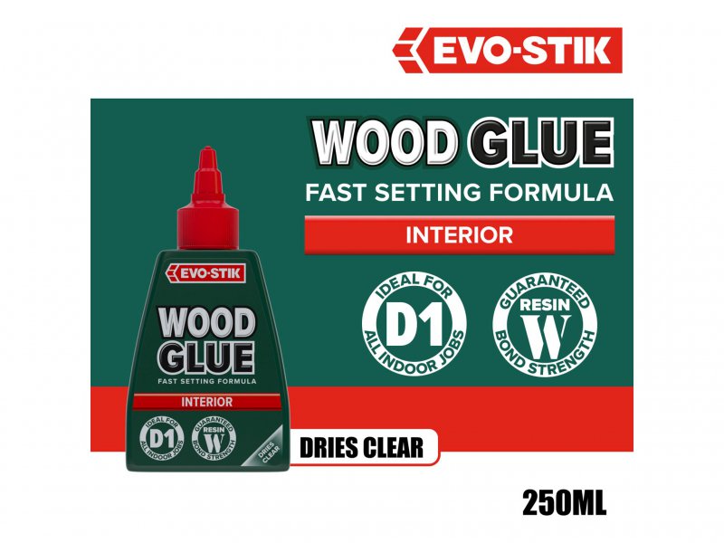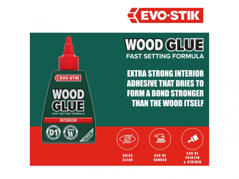 EVO-STIK Wood Glue Interior is an extra strong, fast-setting glue that dries to form a bond stronger than the wood itself. It dries to a clear finish that can be sanded, painted or stained and is suitable for all types of wood.