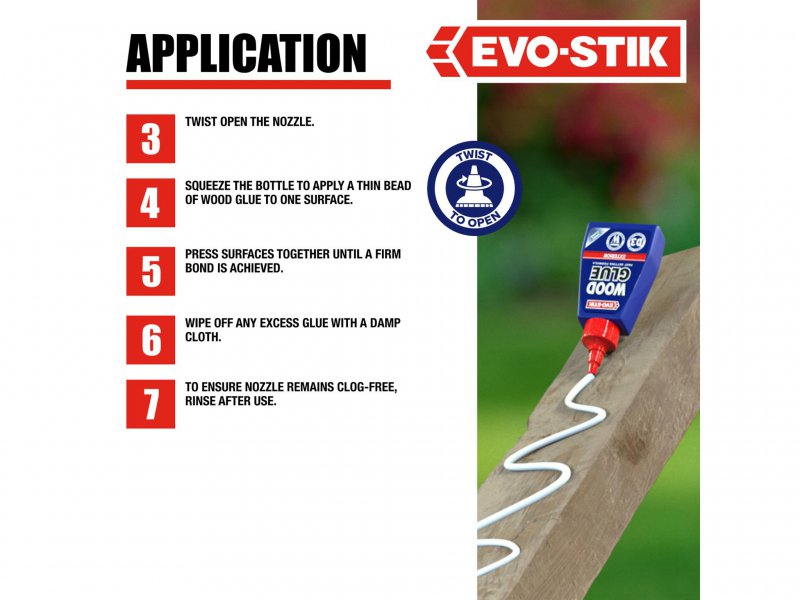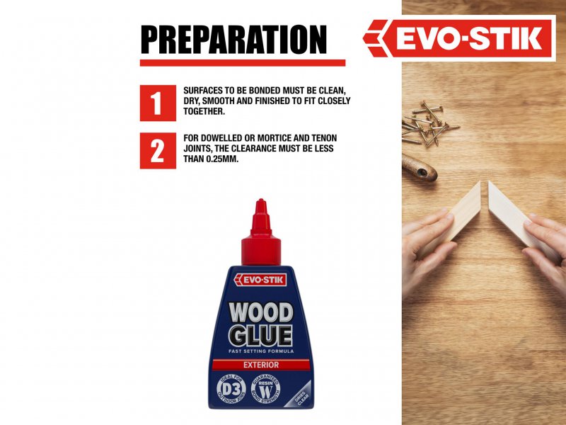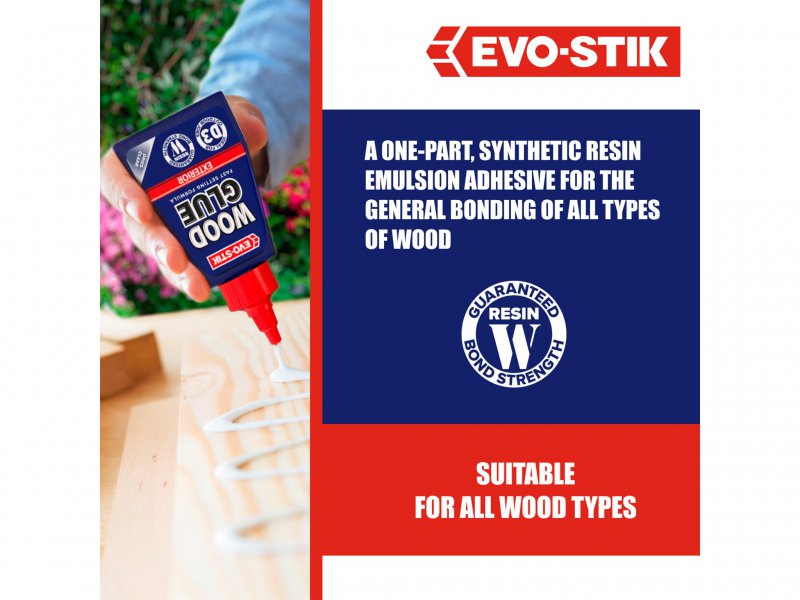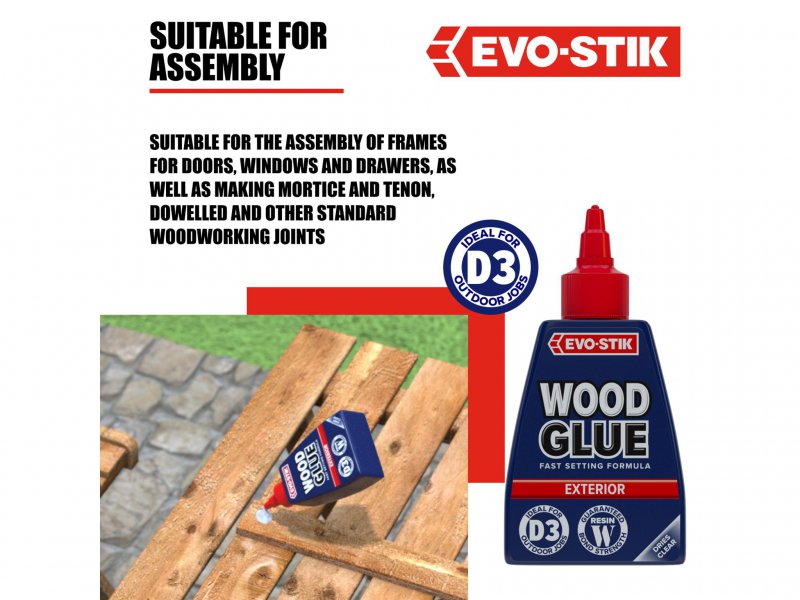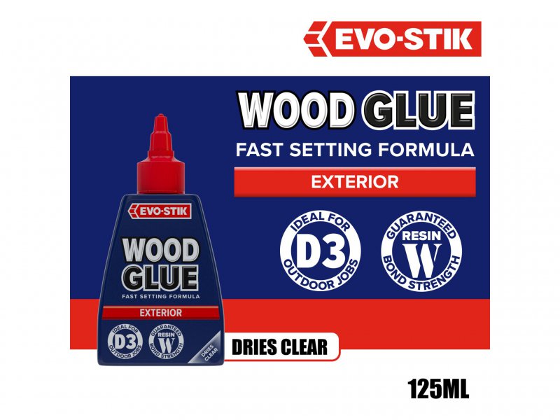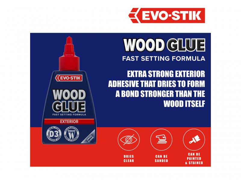 EVO-STIK Wood Glue Exterior is fast setting, extra strong and weatherproof, complies with EN 204 Type D3. Suitable for interior or exterior use and dries to form a bond stronger than the wood itself. Dries to a clear finish that can be sanded, painted or stained. The anti-roll bottle has a no mess, clog-free nozzle and twist to seal cap.