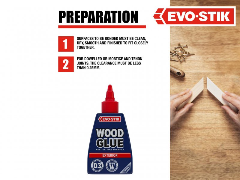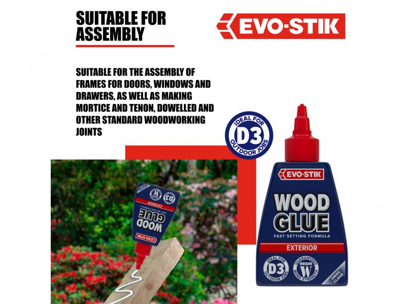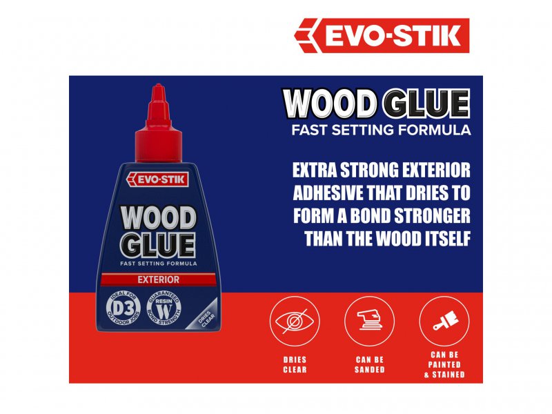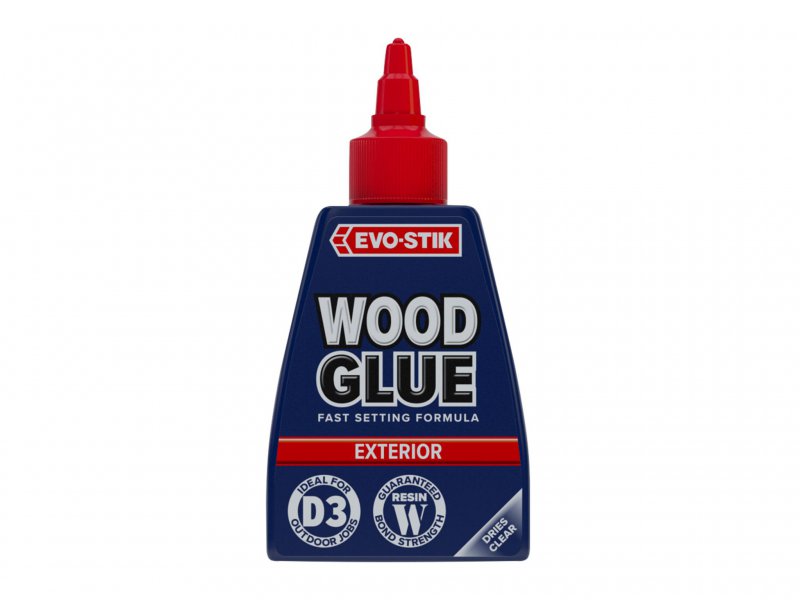 EVO-STIK Wood Glue Exterior is fast setting, extra strong and weatherproof, complies with EN 204 Type D3. Suitable for interior or exterior use and dries to form a bond stronger than the wood itself. Dries to a clear finish that can be sanded, painted or stained. The anti-roll bottle has a no mess, clog-free nozzle and twist to seal cap.