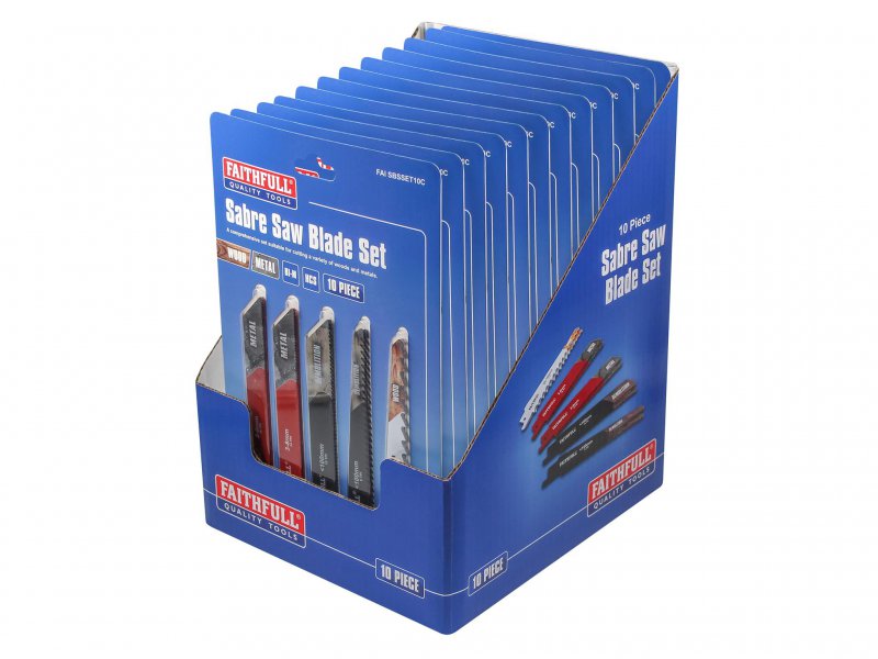 The XMS Sabre Saw Blade Set 150mm Carded, 10 Piece made by Faithfull contains 10 sabre saw blades in 5 popular types allowing you to cut a wide variety of metal and wood, making them ideal for demolition projects.
