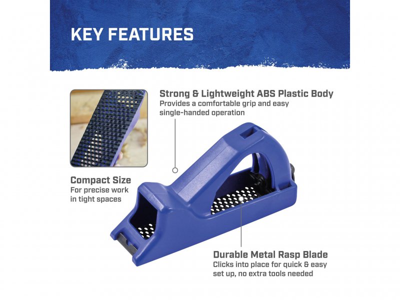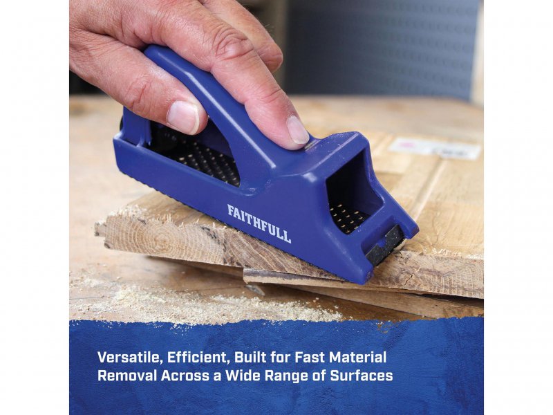 The Faithfull Hand Rasp Block Plane is suitable for removing material from all types of wood, aluminium, plastics, fibreglass and laminates. It can also be used for plaster and filler removal. The lightweight and strong ABS plastic body is shaped like a block plane for easy single handed operation. The durable metal rasp blade clicks into place, making its replacement tool-free and fast.