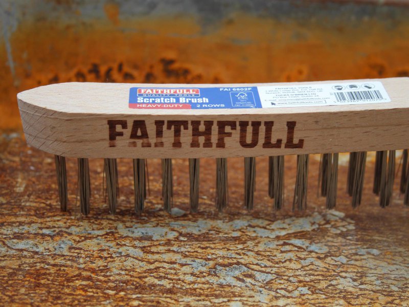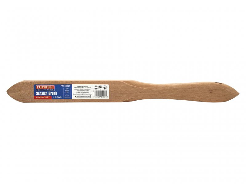 Faithfull Heavy-Duty Scratch Brush. Ideal for removing rust, scale, old paintwork and grouting. It features 28 gauge wire bristles hardened and tempered to provide professionals with longer-lasting abrasion in difficult environments. The handle is made from durable FSC beech wood and has been drilled for hanging, making it easy to store and access whenever you need it.