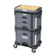 Tools and accessories can be easily transported to the construction site with the robust STACK PACK storage and transport system. The boxes are made of impact-resistant plastic with aluminium-reinforced corners, protecting tools and accessories from the toughest construction site conditions. The boxes have a durable metal latch, with additional handles ensuring flexible and comfortable handling. Interlocking quick-connect fasteners allow fast, flexible and effortless connection of the individual boxes so that the storage system can be assembled according to the user’s specific needs. The set consists of a worktop, two drawer boxes, one with 3 drawers and one with 2 drawers, and the trolley. Ideal for storing accessories and small parts. The contents are always perfectly organised and ready to hand.