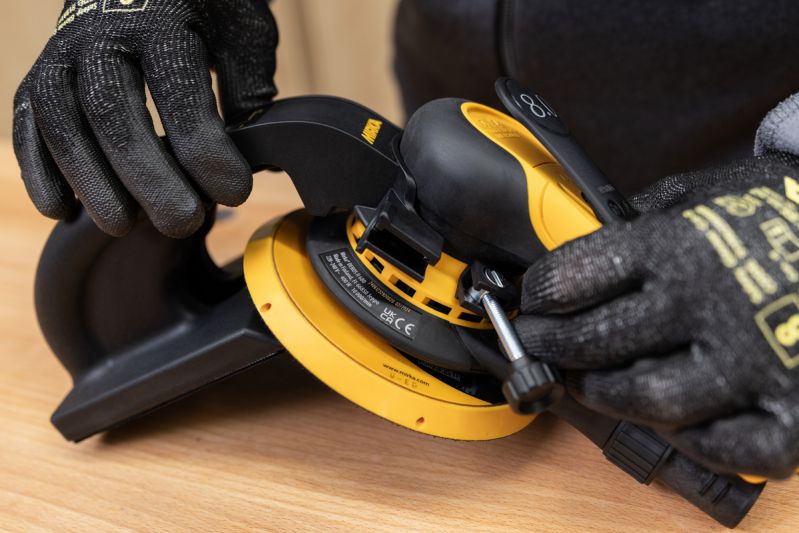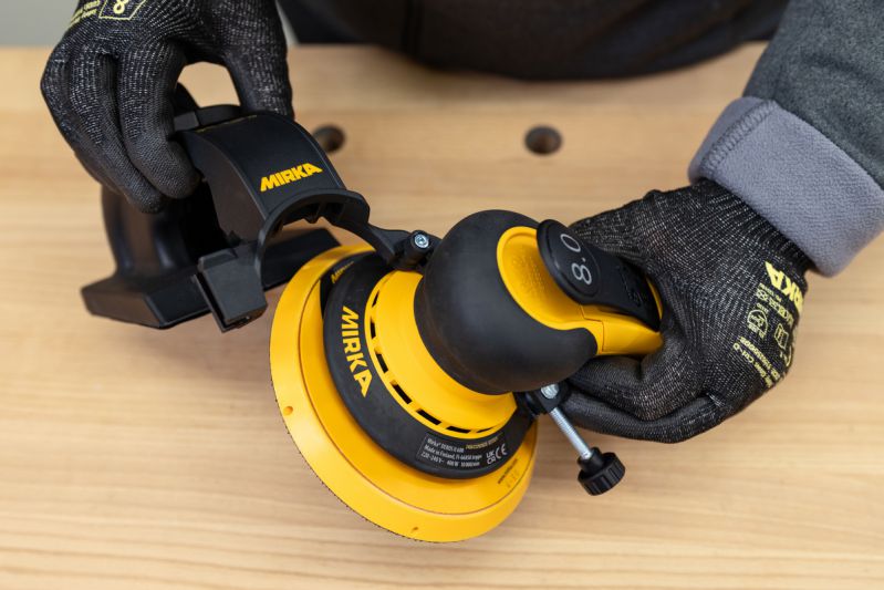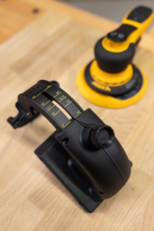 The Mirka® Edge Guide is an edge sanding attachment for Mirka® DEROS II (and DEROS I) that simplifies edge sanding. Its design allows the sander to be guided along the workpiece at a controlled and adjustable angle from 45° to 90°, ensuring accurate and reproducible results. The full support of the guide minimises the risk of tilting or uneven sanding, while its ergonomic construction makes it possible to handle even large panels or workpieces comfortably.