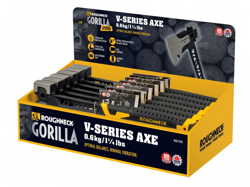 The XMS Gorilla V-Series Axe produced by Roughneck® offers increased striking power and reduced vibration. Manufactured from drop-forged, hardened and tempered steel.