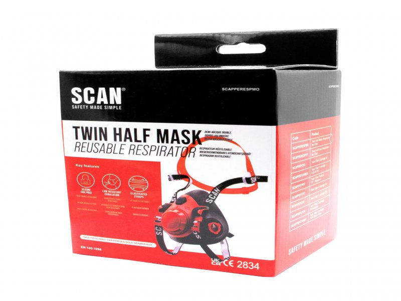 The Scan Twin Half Mask Respirator offers maximum protection and comfort in various environments. Covering the nose and mouth providing a seal to protect against harmful substances like dust, fumes, vapours, and gases. The adjustable elastic straps ensure the mask is properly sealed around the mouth and nose. Fitted with bayonet connectors to accept the Scan range of particle and gas cartridges. Supplied without filters.