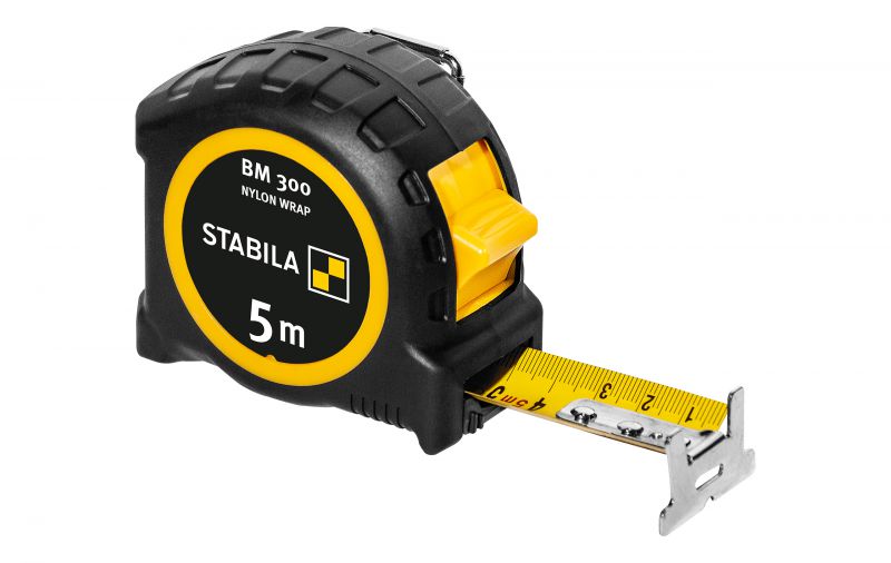 The Stabila BM 300 Robust Pocket Tape has a shatterproof PC/ABS housing with a shock-absorbent soft grip casing that provides protection against heavy impacts. Extremely hard-wearing STABILA NYLON-WRAP protects the blade against corrosion and abrasion. The coating also features STABILA SPIKES to help prevent slipping.