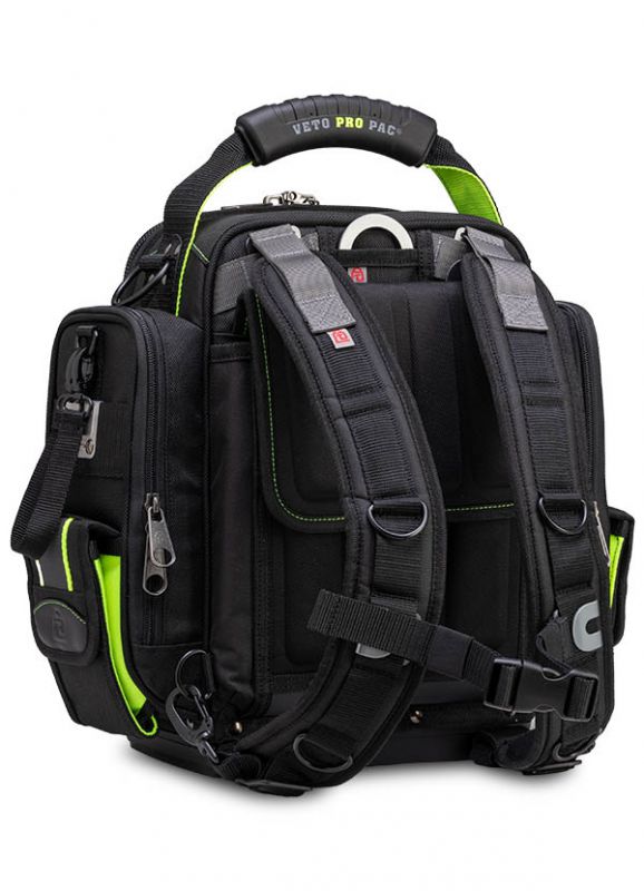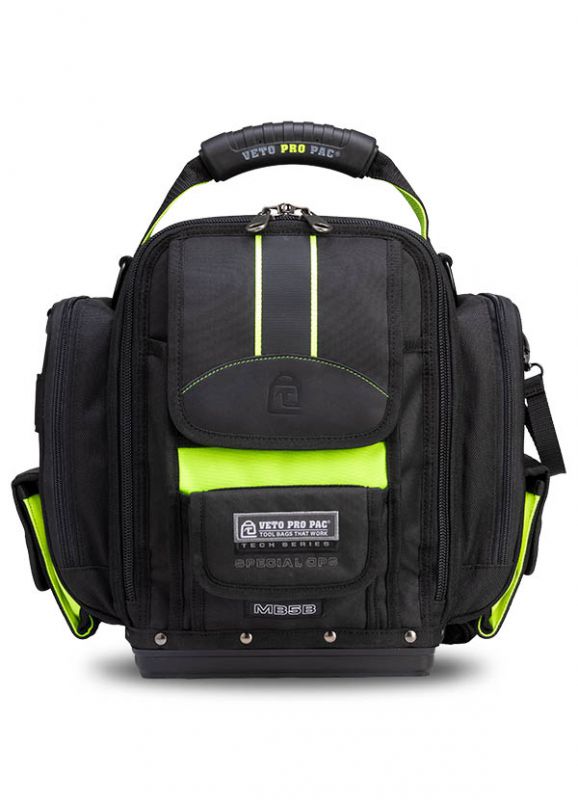The MB5B SPECIAL OPS is a extra large and highly-configurable front accessed meter bag in a black and Hi-Viz yellow color scheme. Once the bag is loaded out, it can be worn over both shoulders using the included backpack straps, over a single shoulder using the optional padded shoulder strap, or at your side with over-molded gripped handle. Finally, the bag features an additional 8 pockets on the front flap as well as a padded tablet computer pocket on the back. The MB5B SPECIAL OPS stores a variety of hand tools inside the bag while separately storing 1-2 clamp meters in the 2 padded side mounted zippered pockets.
