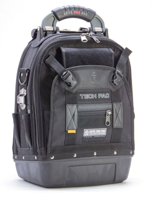 The Tech Pac Black is a blacked-out back pack based on our Tech Pac but with removable tool pocket panels which can be rotated or swapped out with a laptop panel, to turn the bag into a tool bag/laptop bag. Includes Front Tool Panel and Back Tool & Meter Panel, Laptop Panel Sold Separately.